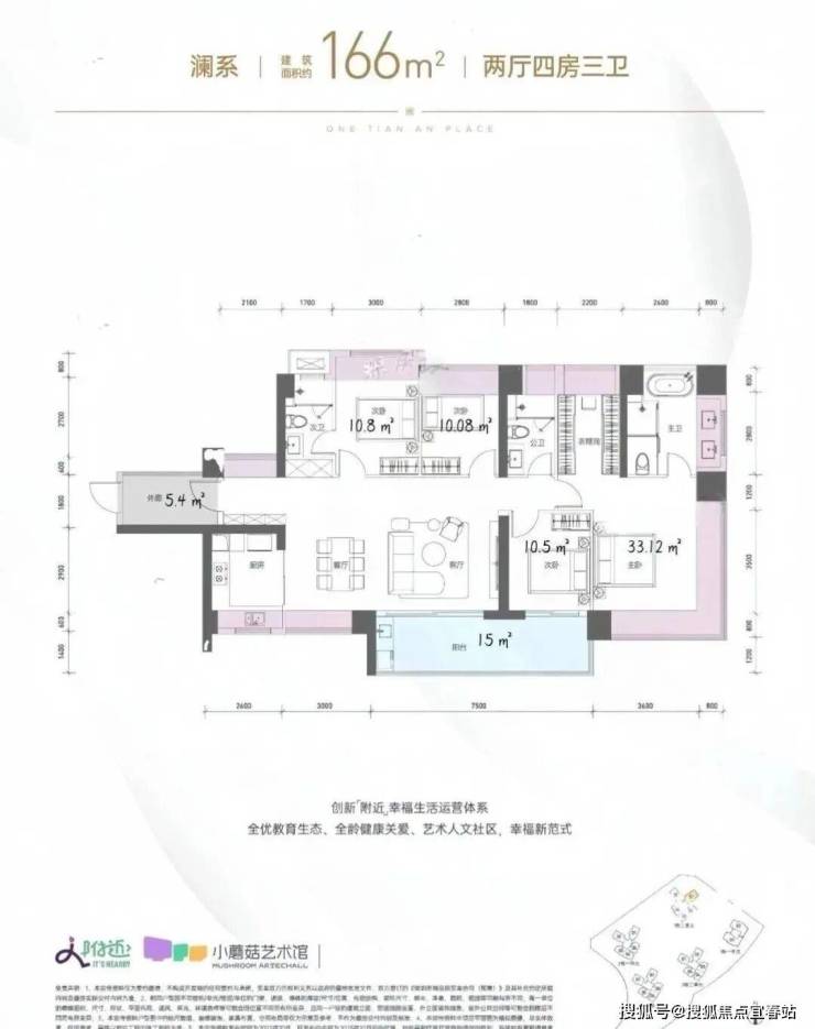 166㎡的4房2厅3卫,1栋2单元01户型,设计的是横厅南北通透格局,独门独户,赠送约5.4平的入户空间,客餐厅7.5米开间,LDKB一体化设计,五开间朝南,主卧带大衣帽间,双套间设计,分别做到了主卧33.12㎡/次卧10.8㎡/次卧10.5㎡/次卧10.08㎡(包含墙体飘窗),客厅连接次卧出7.5米长的大阳台约15平,U型厨房,卫生间干湿分离,得房率约100.24%(包含赠送),西南或东南朝向。飘窗赠送面积20.7㎡+阳台赠送7.5㎡+外廊赠送5.4㎡=实际赠送33.6㎡。