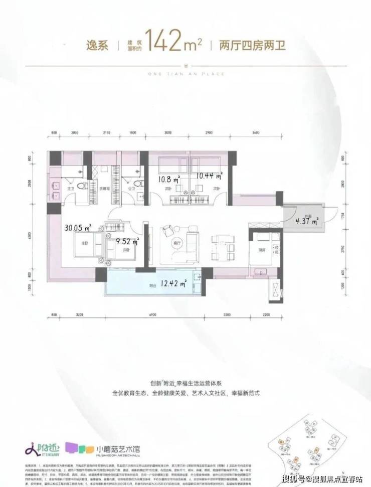142㎡的4房2厅2卫,2栋1/2/3单元02户型,设计的是横厅南北通透格局,独门独户,赠送约4.37平的入户空间,客餐厅7.3米开间,LDKB一体化设计,五开间朝南,主卧带大衣帽间,分别做到了主卧30.05㎡/次卧10.8㎡/次卧10.44㎡/次卧9.52㎡(包含墙体飘窗),客厅连接次卧出6.9米长的大阳台约12.42平,U型厨房,卫生间干湿分离,得房率约104.2%(包含赠送),西南或东南朝向。飘窗赠送面积23.8㎡+阳台赠送6.21㎡+外廊赠送4.37㎡=实际赠送34.38㎡。