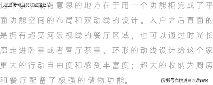 方案三易其稿,410平米的空间最终敲定的平面里只保留了两个卧室,但他们并没有把大量的空间留个客厅,而是将其均衡地分配给厨房、餐厅、茶室、卧室等生活的功能空间以及储物的空间。