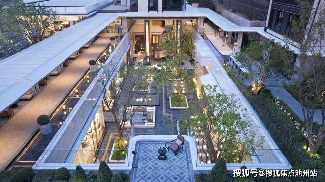下沉庭院以约6.15米高的悬挑水帘、水中下沉卡座,构筑行走于水上的通行体验,与地下配套用房对话。地上地下的双园驱动,以直径约2.5米的雅典黑金花水钵为起点,以直径约2米的黄金麻整石水钵为终点,通过金澜线条的延续,串联景观故事线,回应湖映金沙的营销价值。