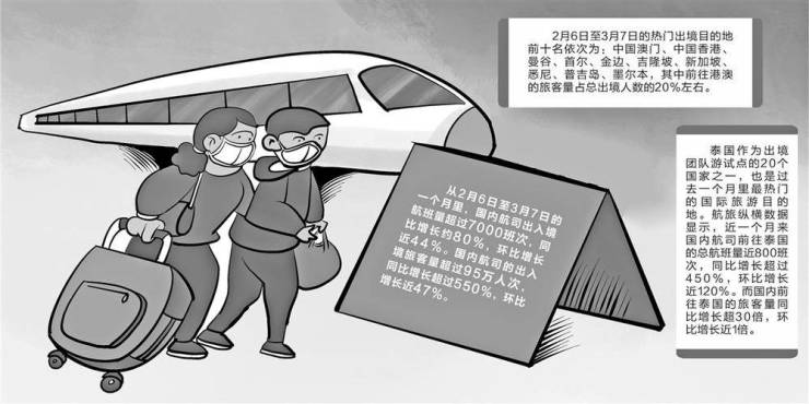 从航司及旅行社的部分经营数据中,已经能够看到出境游明显的复苏信号。记者从航旅纵横获得的数据显示,从2月6日至3月7日的1个月时间里,国内航司出入境航班量超过7000班次,同比增长约80%,环比增长近44%。国内航司的出入境旅客量超过95万人次,同比增长超过550%,环比增长近47%。