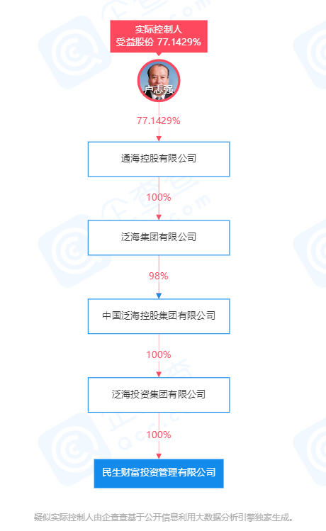 企查查APP显示,民生财富成立于2014年,其经营范围显示为:金融信息服务(除金融许可);资产管理,投资管理,投资咨询等,注册资本20亿元。企查查股权穿透显示,泛海投资集团有限公司持有民生财富100%股权,疑似实际控制人为卢志强。