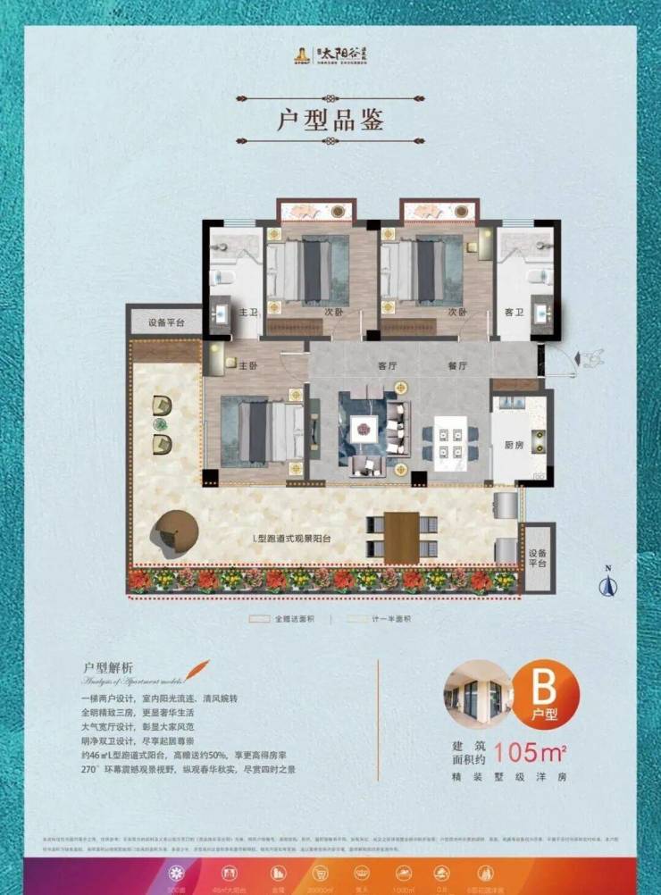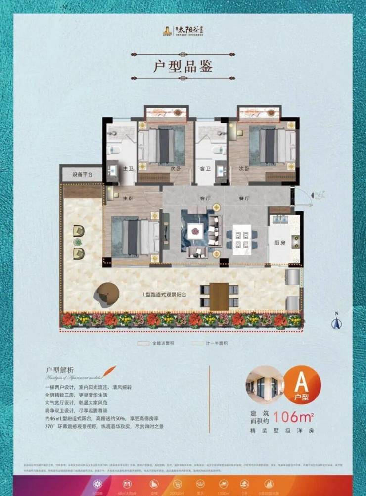 约46㎡L型跑道式大阳台,高赠送50%
