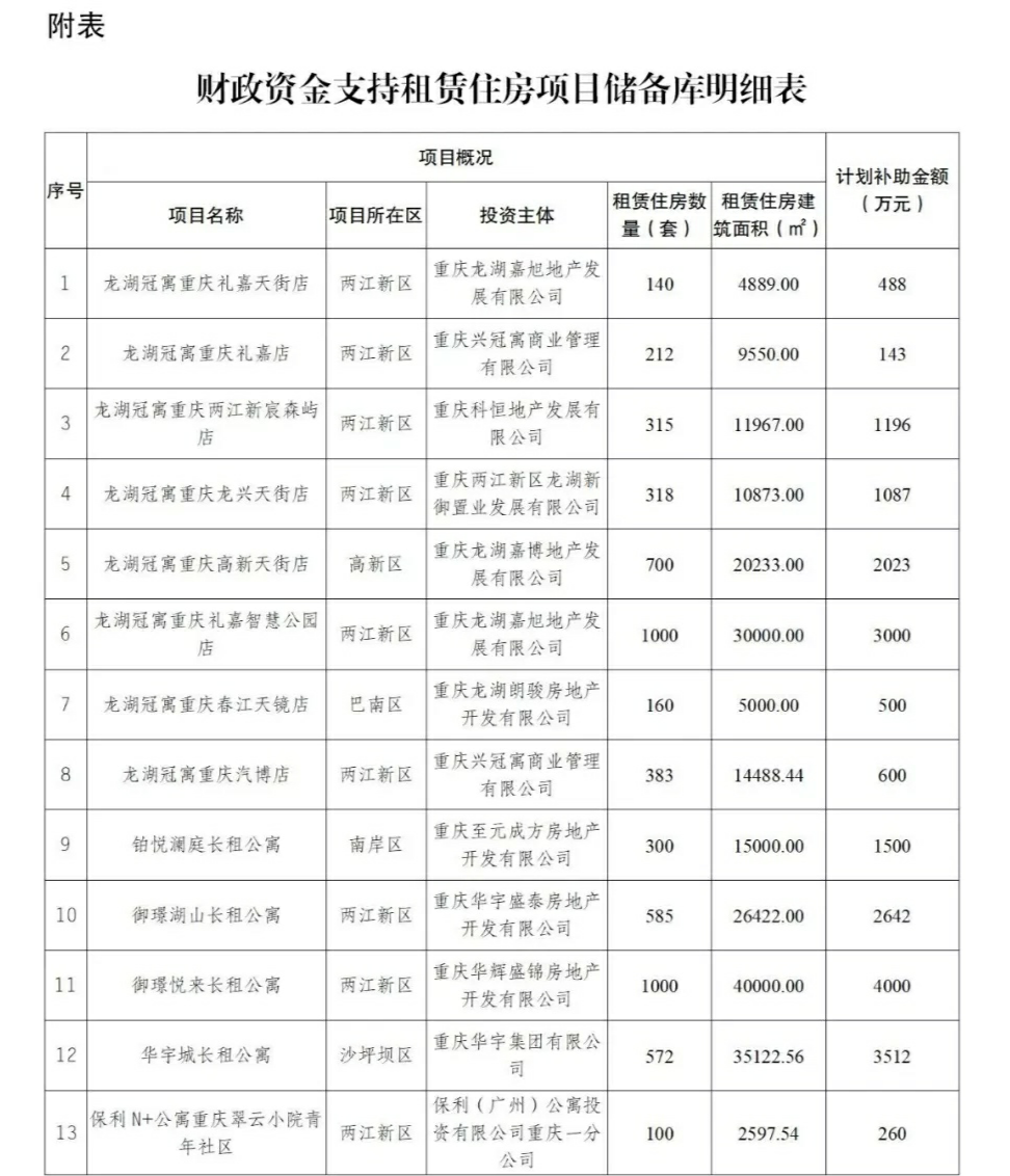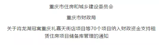 重庆市住房和城乡建设委员会、重庆市财政局的发文,包括龙湖冠寓重庆礼嘉天街店项目在内的70个项目,被纳入财政资金支持租赁住房项目储备库管理。