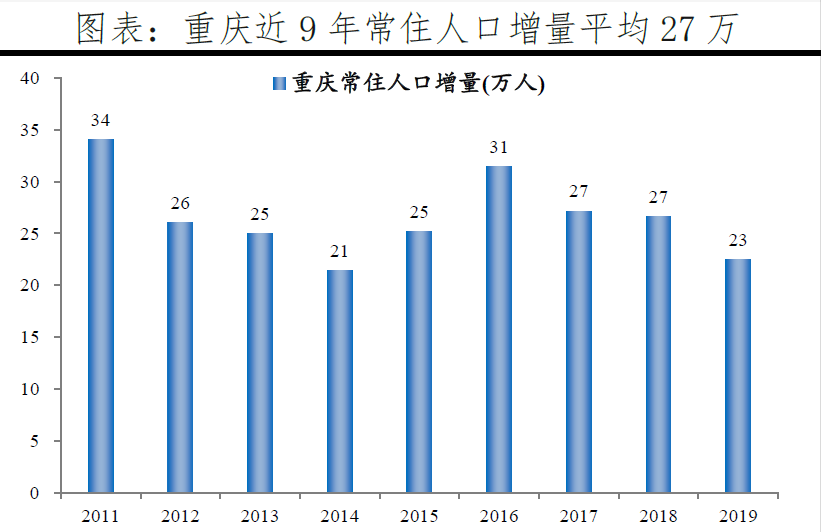 另一方面,研究显示,重庆常住人口增量维持在高位,2011-2019年增量平均为27万。