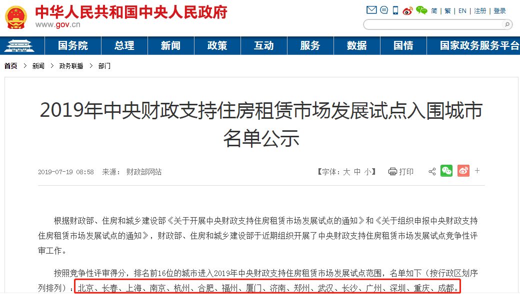 2019年7月,财政部、住房和城乡建设部发布了《2019年中央财政支持住房租赁市场发展试点入围城市名单公示》,显示包括重庆在内的全国16个城市成功入选。