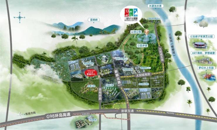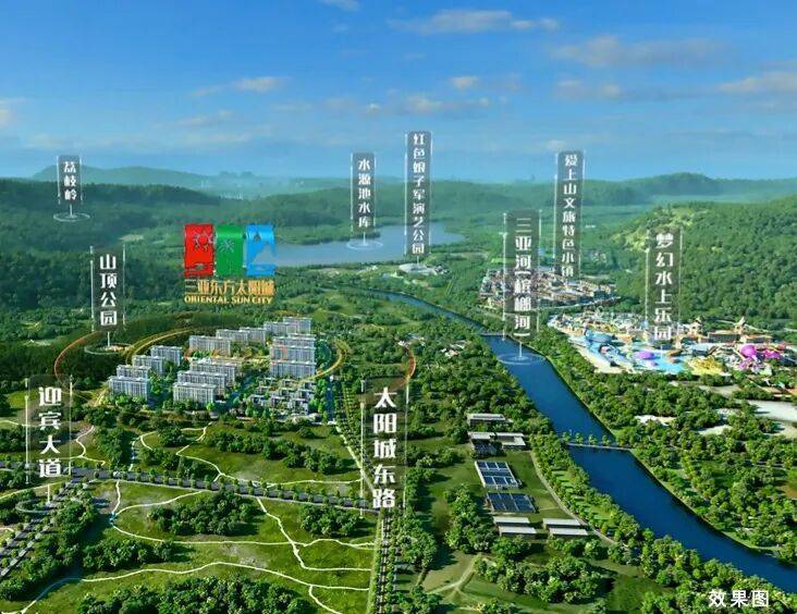 三亚·东方太阳城,西卧山顶公园,东拥三亚河(槟榔河),近享水源池水库、荔枝岭生态景观,面朝三亚主城区、三亚湾等,以山河为靠,以繁华为景,打造天赋上境栖居地。