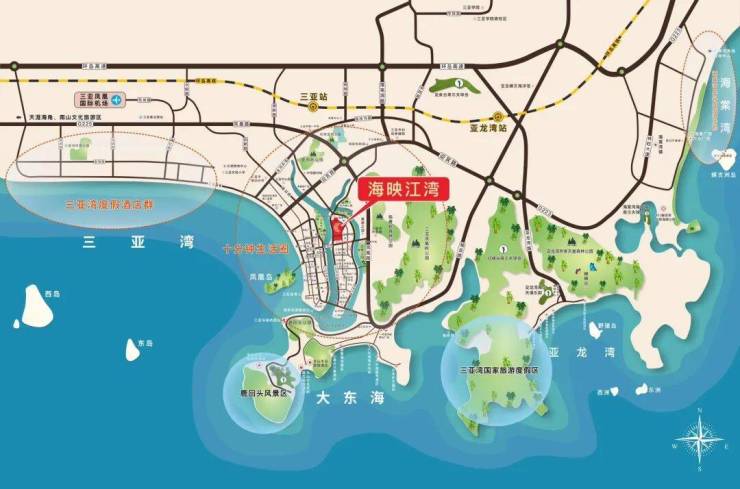 🚗便捷交通:海映江湾项目位于河东路,北接迎宾路,南至鸿洲游艇码头,居三亚城市主干道解放路与凤凰路之间,距离三亚湾直线距离仅1.3公里,距离三亚汽车站约1.4公里,车程约6分钟,距离三亚凤凰岛约2公里,距离大东海旅游区约5公里,车程约13分钟,距离凤凰国际机场14公里,车程约37分钟。距离海棠湾约26公里,车程约40分钟。