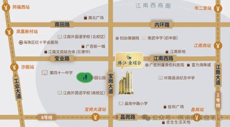 2/8号线双地铁上盖:约280米即达8号线宝岗大道站,20分钟直通达珠江新城;约800米2号线江南西地铁站,可通达广州南站等大型交通枢纽;