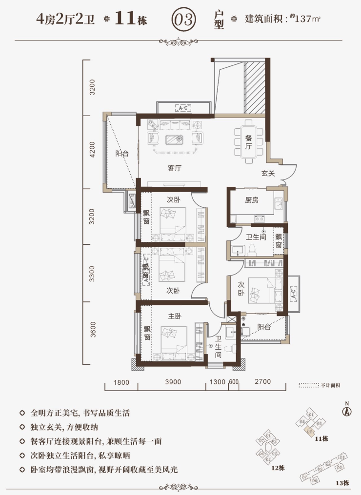 四期全新约104m²——152m²精装户型,更通透、空间布局更合理、居住更舒适。全面采用升级“5U”精装修居家理念,运用人体工程学实用舒适设计,严选高品质环保建材和世界知名品牌家居,如西门子、汉斯格雅、德国唯宝、西蒙、罗马利奥瓷砖、博洛尼、立邦等。严格设置质量保障体系,让家的温馨弥漫每一寸生活空间。