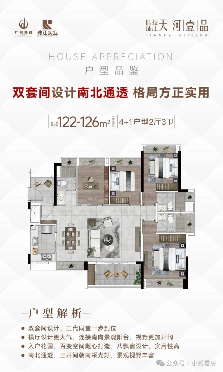 建面122-126平4+1房,双主套配置,四开间朝南采光,大横厅设计,全屋8个飘窗+入户花园+观景阳台+厨房窗户,整整11个采光面,所有卫生间都带飘窗。
