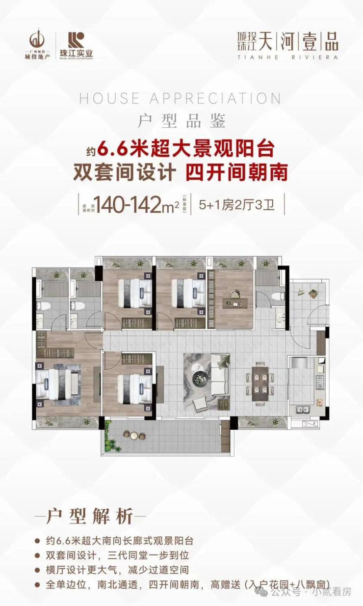 建面约140平五房,此户型在126平的基础上放大空间,并将双开间阳台升级到6.6米,全单边位+五开间朝南+全屋南北对流
