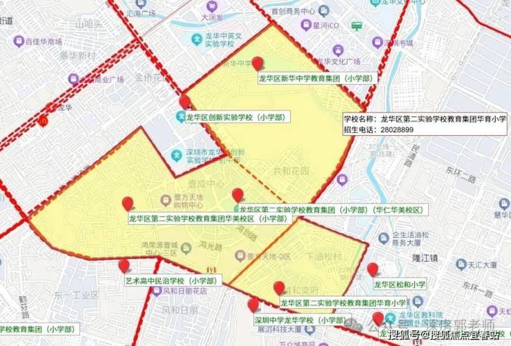 依据2024年龙华区教育局的学区划分方案,小学学区涵盖龙华第二实验学校华美校区、龙华区新华中学教育集团小学部;初中学区为龙华第二实验华美校区。