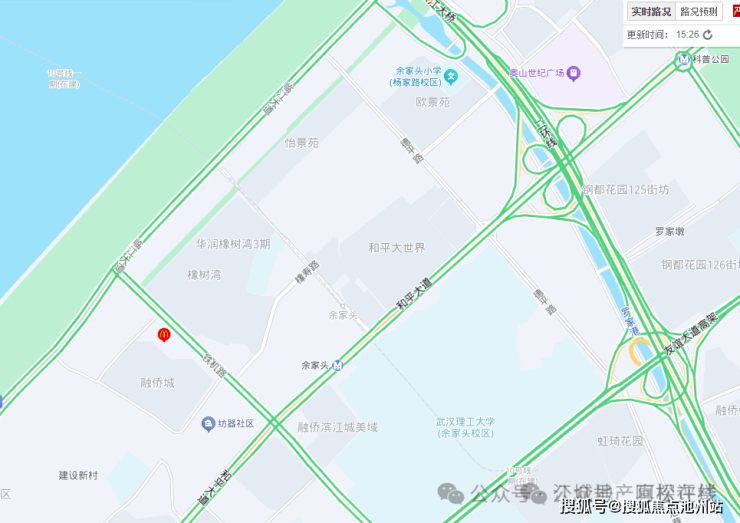 自驾:项目紧临的临江大道与和平大道,都是大武昌横向主干道,不过这2条路红绿灯也较多,并非快速路。经临江大道或和平立交上二七长江大桥、长江二桥等,都比较方便。另外,项目西侧铁机路在建有二七路-铁机路过江通道,规划为双层双向6车道过江隧道,武昌段出口位于铁机路上,项目附近有无出口还不确定。