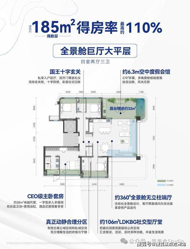 建筑面积143㎡户型,实得约194㎡,横厅设计,尊享电梯直接入户。独具匠心,设有独立玄关,配备超大露台,露台挑高6.3米,彰显气派。主卧奢华套房,配备双面采光独立衣帽间,尽显生活品质。