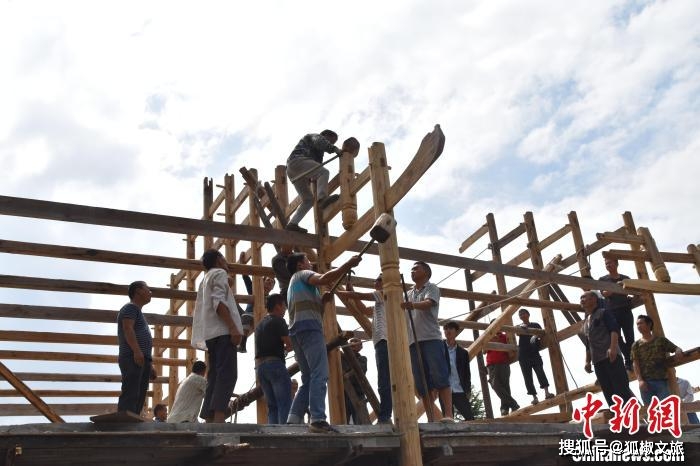 刘安喜(右三)在指挥工人进行吊脚楼架梁
