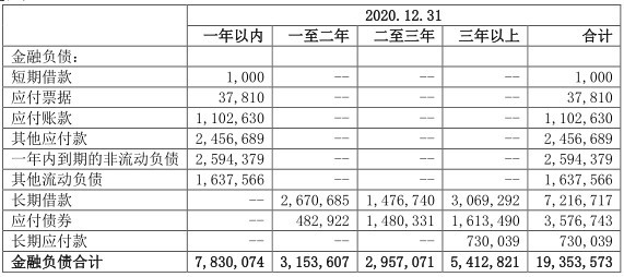 截至2020年底,其金融负债约1935.36亿元,一年以内到期金融负债为783亿元,占比为40.46%。