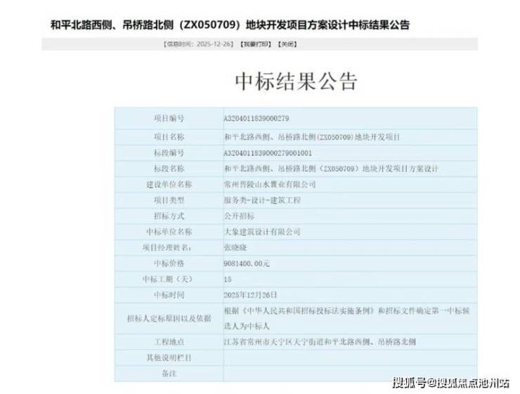 2025年年底,项目发布设计方案中标结果公告,将会由常州晋陵山水置业有限公司建设,大象建筑设计有限公司设计中标,中标价格为9081400元。