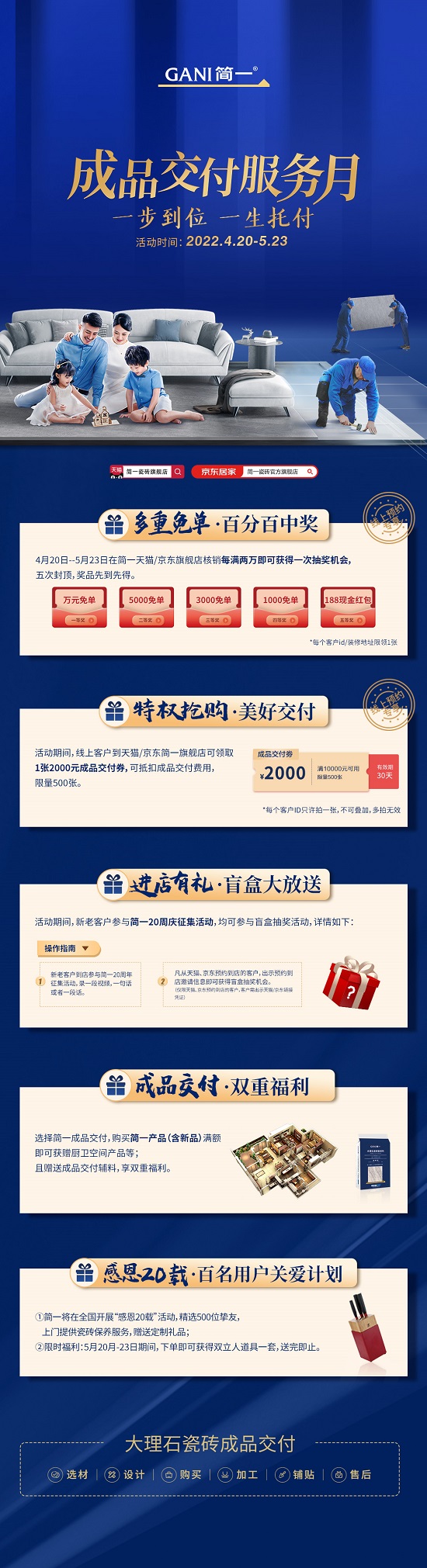 伴随着简一成品交付迎来发布一周年之际,4月20日,以“一步到位,一生托付”为主题,简一成品交付服务月正式拉开序幕,线上线下齐发力,推出万元免单、盲盒大放送、免费上门瓷砖保养服务等宠粉福利。