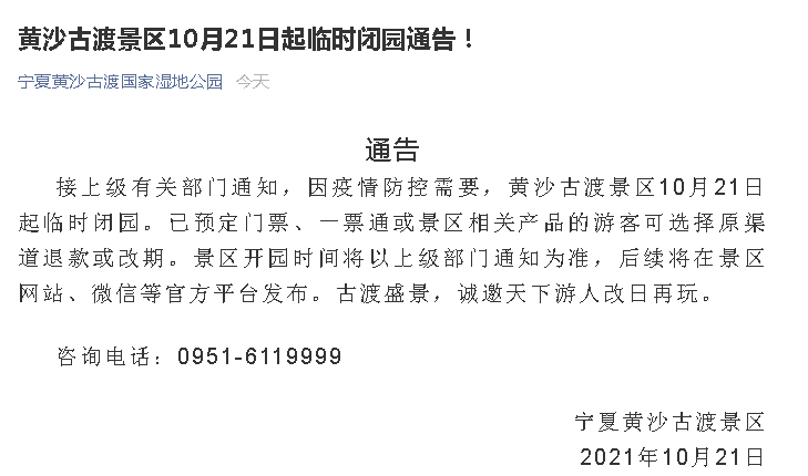宁夏:黄沙古渡景区10月21日起临时闭园通告
