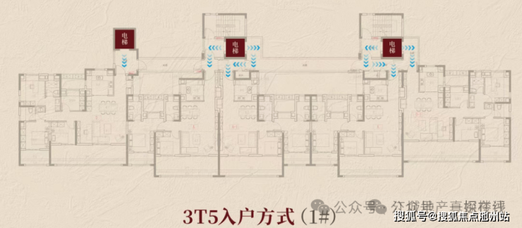 最小面积是建面约105平的三房两厅两卫:该户型在1号楼中间户,属于连廊中间套户型,私密性有一定影响。不过该户型利用双开门电梯,做到了局部独立入户前室。