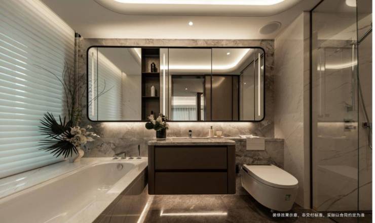 卫浴空间,配备兼容艺术感与实用性的劳芬壁挂马桶,当代的卫浴龙头配合金茂独有的全屋净水系统,越级的配置,予生活无可挑剔的奢适体验。