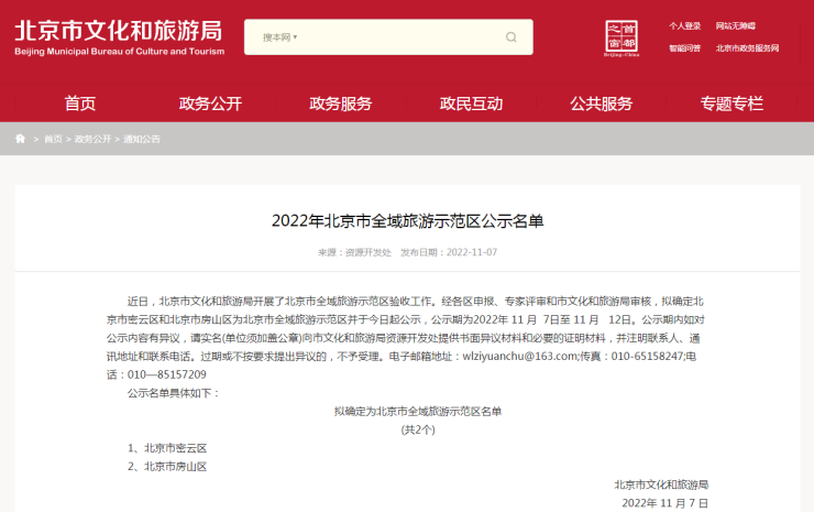 拟确定北京市密云区和北京市房山区为北京市全域旅游示范区并于今日起公示,公示期为2022年11月7日至11月12日。