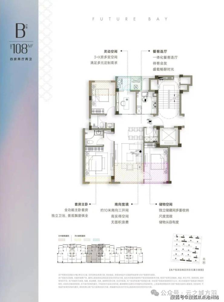 建面约108㎡的户型,已经做到了四房两卫一储藏室的4+1格局。算上封闭阳台,云之城的使用率最高约有96%。