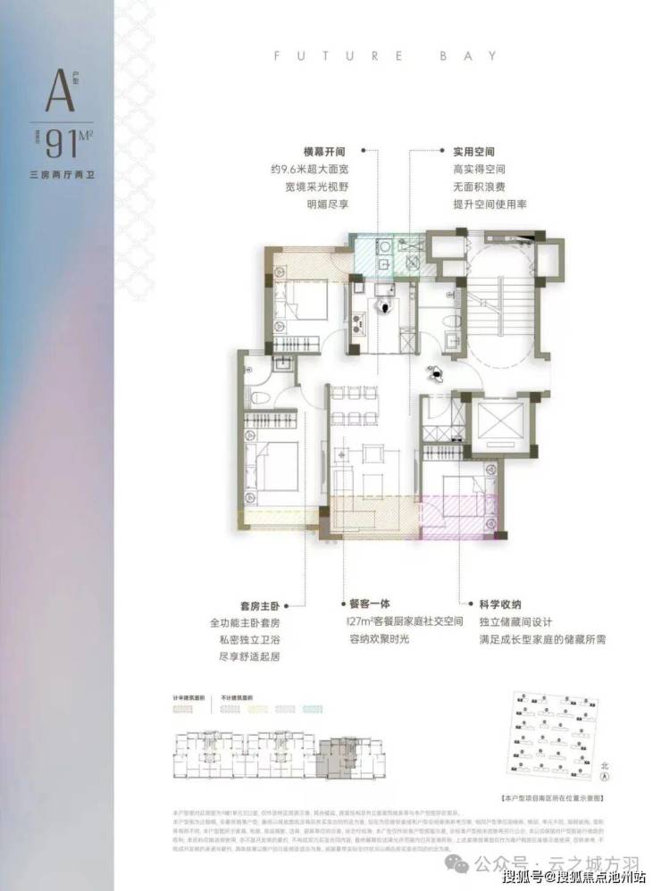 建面约91㎡的起步户型,其他项目的同面积段产品往往还在卷2+1的格局,云之城已经做到三房两厅两卫,再加一个独立储藏间的3+1格局,解决现在年轻人的收纳痛点,无论是露营车还是大行李箱,储藏间全部能放下。