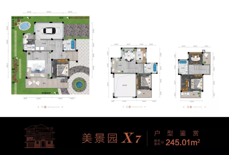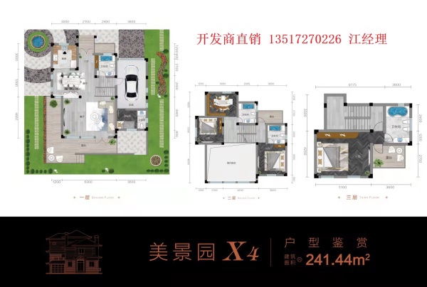 户型鉴赏美景园经典小独栋,建面:237㎡至260㎡之间,总占地在350㎡—600㎡之间,