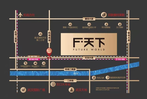 F天下的地理位置得天独厚,是距离武汉汉口中心最近的别墅住区。其立体快速交通畅达。近邻地铁2号线巨龙大道站、7号线延长线腾龙大道站(在建中)、20号线腾龙大道站(规划中),快捷直抵武汉天河国际机场、汉口火车站。借助临空经济腾飞和长江新区规划建设的双重利好,F天下项目周边的商业、教育、医疗、文旅等各类配套已十分醇熟。