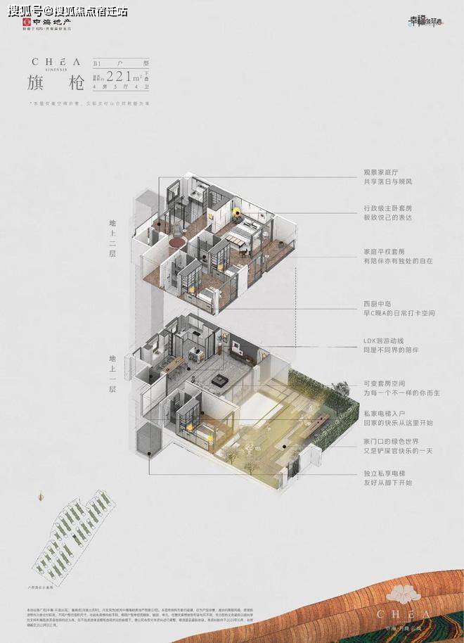 以建面约210㎡的上叠“云雾”和建面约221㎡的下叠“旗枪”为例。月陇云岚解决了很多叠院上下叠共用电梯这个痛点,在这个项目里,所有的户型都是私梯入户的。下叠入户口在南向花园,上叠在一楼也有北向私梯入户花园空间。