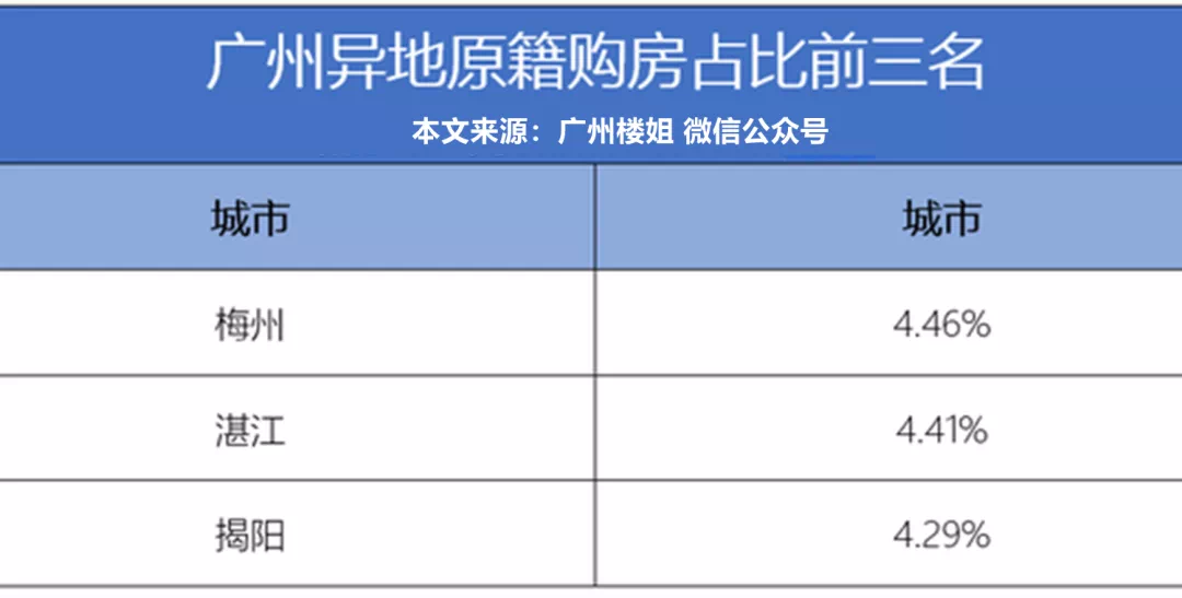 回答:根据楼姐整理的表格数据,广州异地原籍购房占比前三名,依次为梅州、湛江、揭阳,分别占比 4.46%、4.41%、4.29%。作为老广州人,除了本土置业,最喜欢的就是跑到隔壁佛山去买房子,在佛山购房客群中除本城市户籍居民外,广州人占比较高,为5.76%。这主要是因为随着广佛一体化的推进,尤其是地铁轨道交通拉近了广佛之间的距离。