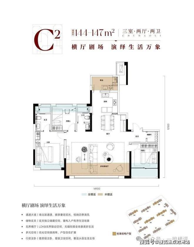 建面约144平户型还是做的三房两卫,不过做了很大的横厅,变成3+1房,基本也能实现四房功能。