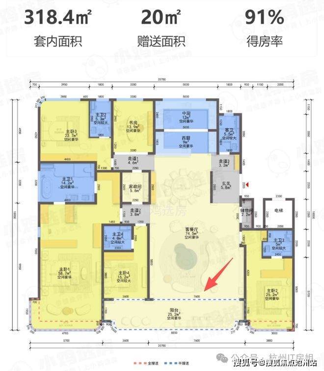 整个户型奢侈感满满,正南厅设计,南向开间达20.7米,南向三个套房设计+7.6米宽大客厅+25.2㎡大阳台。