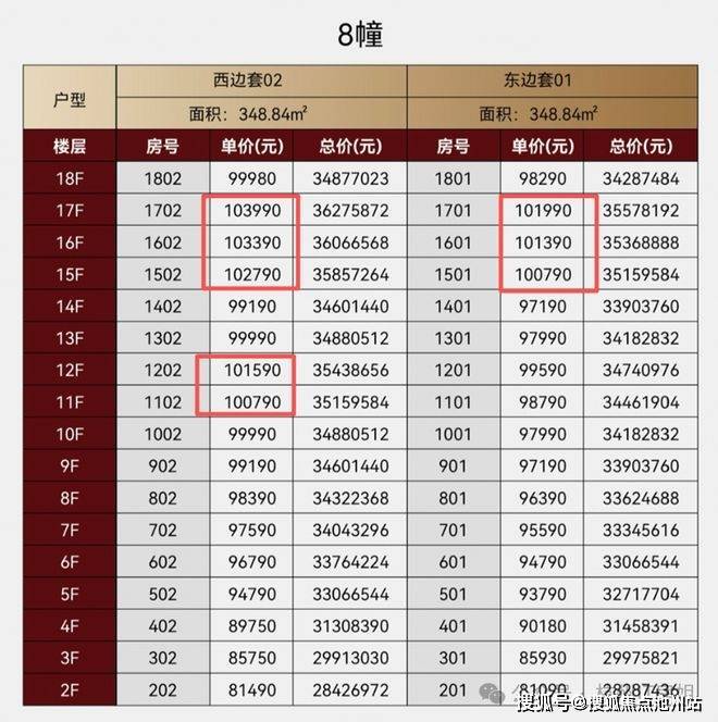 来看下8#楼层单价,部分高楼层达到10万+单价,总价3500万+。