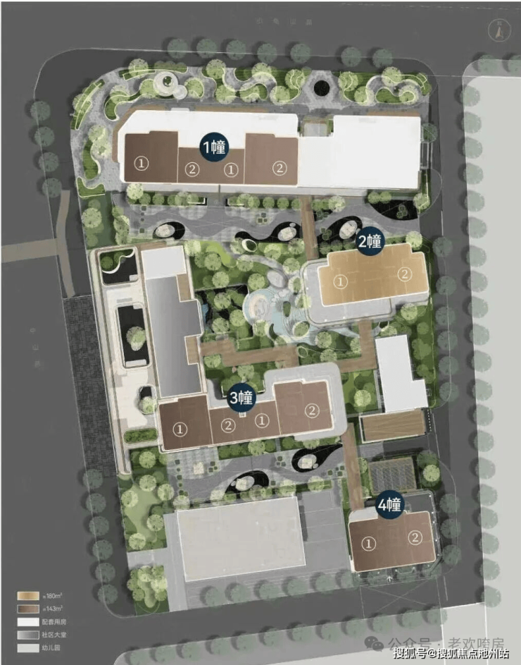 共包含4栋住宅一所幼儿园以及一处两层的邻里中心(含生鲜超市等商业)。