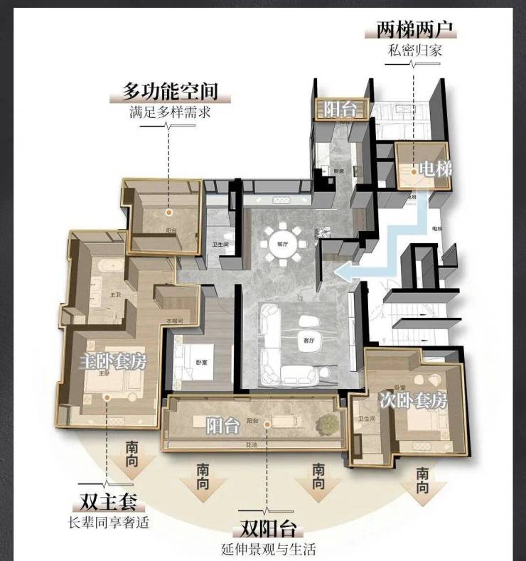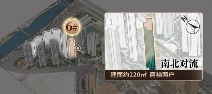 约220㎡大平层,户户四开间朝南,户户南北对流大方厅,户户两梯两户专属归家,户户双主套双阳台……