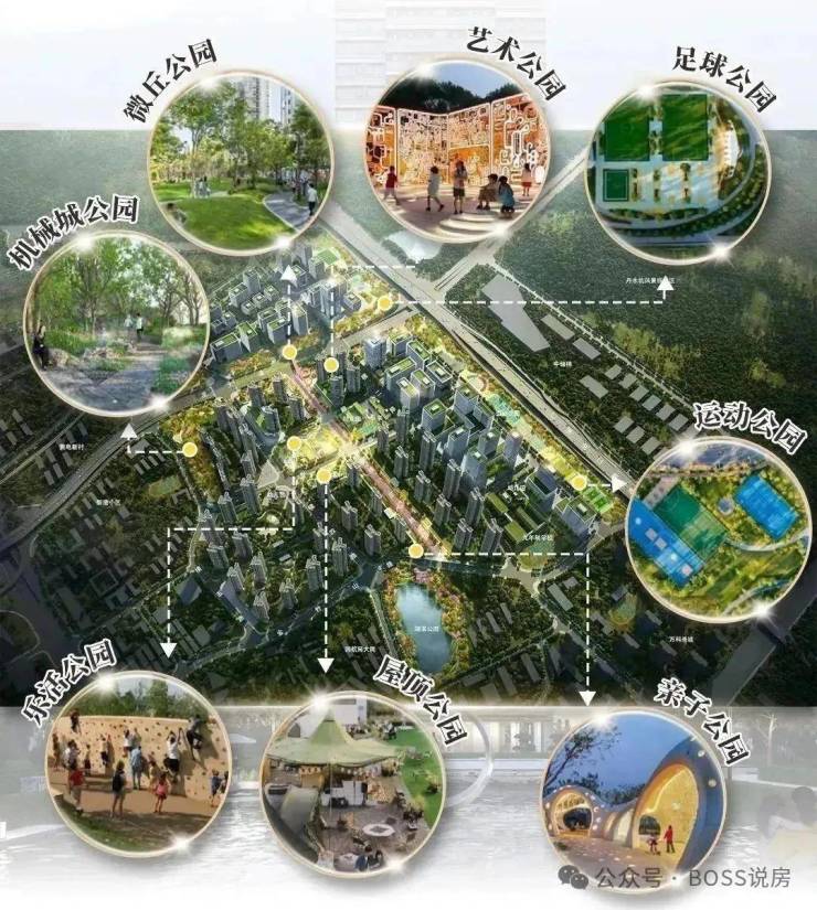 公园绿地:周边 3km 范围内有 91 个公园,距离最近的仅 239m,小区南侧和西侧规划了与小区体量相当的公园绿地(机械城公园),此外还有街角公园,形成绿色屏障,可有效降噪降尘