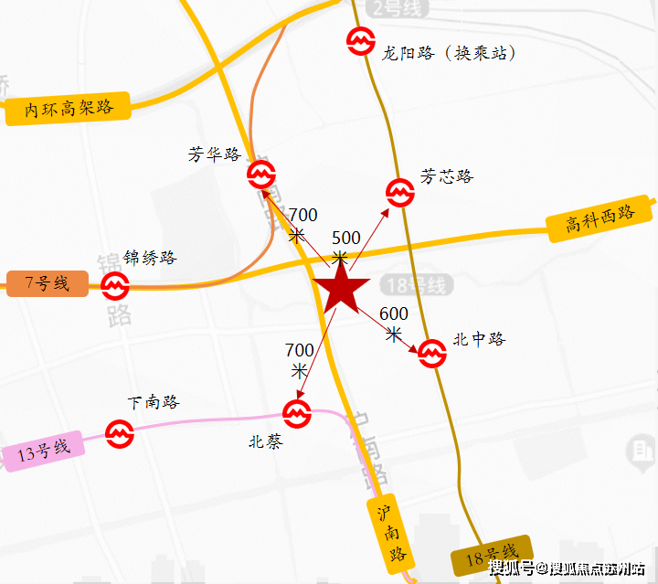 项目周边有地铁7、13、18号线三轨环绕:18号线芳芯路直线距离约500米,北中路站约600米;13号线北蔡站约700米;7号线芳华路站约700米。