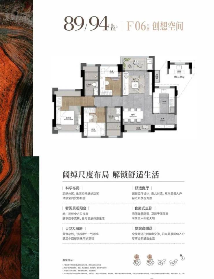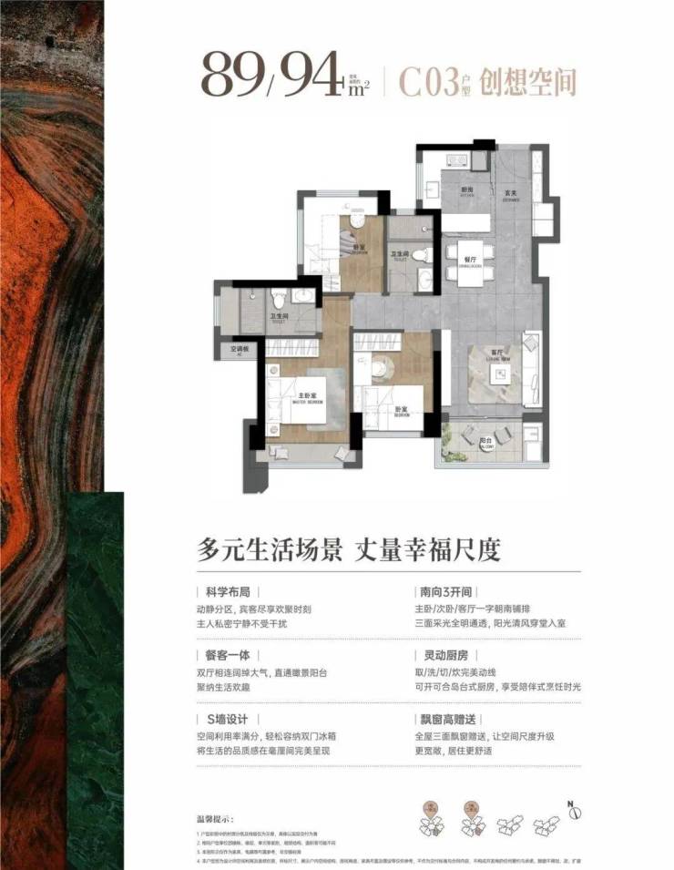 89-94平:3房2厅2卫,套内净使用率在80%,东南朝向