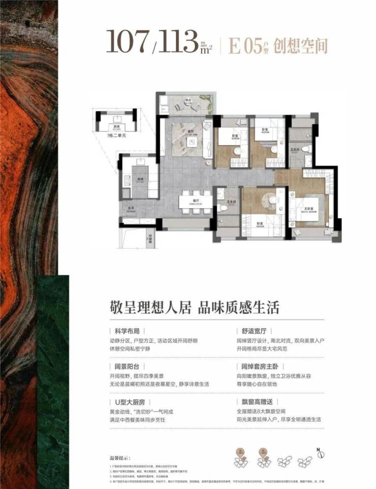 提供83-113平方米的3-4房户型,空间利用率高,如83-87㎡的3房2厅2卫户型采用经典竖厅格局,LDKB一体化设计,三开间朝南,得房率约76-81%(不含赠送),部分户型赠送后得房率可达88-93%,性价比高。