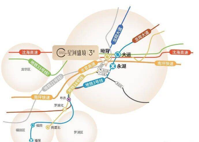 项目紧邻地铁3号线永湖站(步行约500米)和14号线坳背站(步行约1.1公里),14号线可1站直达大运枢纽,5站至罗湖、6站至福田,未来规划中的21号线和33号线将进一步强化与坂田、南山及机场东的快速连接,形成覆盖全城的“五纵四横”路网结构,自驾出行也较为便捷。