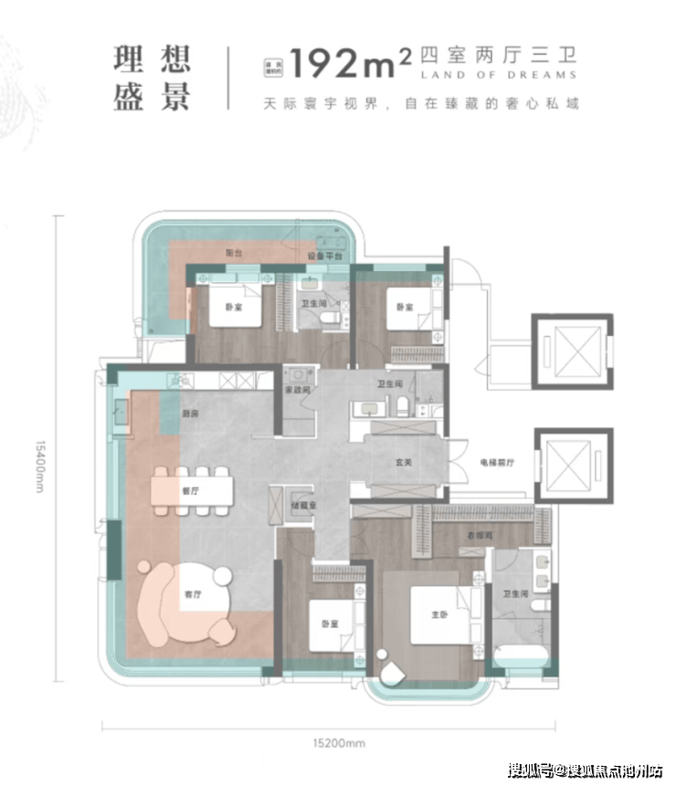 从户型图设计可以看到,小区用了大量的弧线设计,北向阳台、南向主卧、客厅都是270°弧形设计,视野采光会非常不错,每个户型,都设计了北向阳台,可以解放南向阳台的家政功能,所有户型都是LDKB一体化,主卧套房全部朝南,而且这两栋楼,南向是学校的低层建筑,采光视野都非常好。
