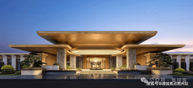 宽约78.8米、高约9.2米的大门,铺装大面积的梵高白奢石和古驰黑石材;四根梵高白立柱托起古铜色铝板;层层抬升,宛若步步登临殿堂。