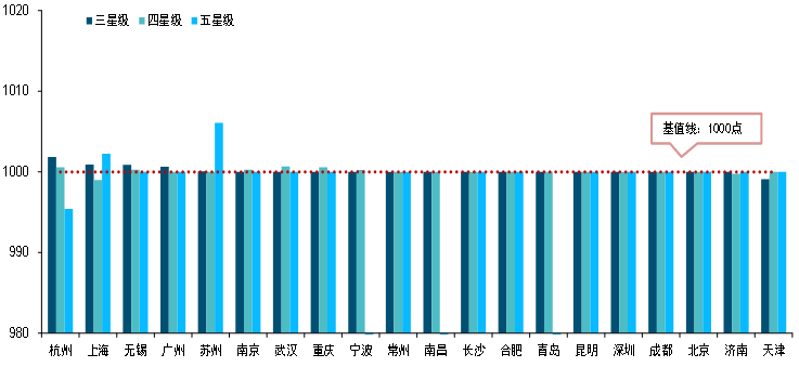 同比来看,三星级物业服务价格指数中,杭州、宁波、无锡等11个城市较去年同期上涨,而天津受部分项目物业费下降影响,为同比唯一下跌城市,跌幅0.03%;四星级物业服务价格指数中,杭州、南京、苏州等9个城市较去年同期上涨,济南受疫情等因素影响,部分项目物业费下降,物业服务价格指数较去年同期下跌0.02%;五星级物业服务价格指数中,苏州、南京、上海、常州共4个城市较去年同期上涨,而杭州因部分五星项目物业费下降,使其五星物业服务价格较去年同期下跌0.35%。