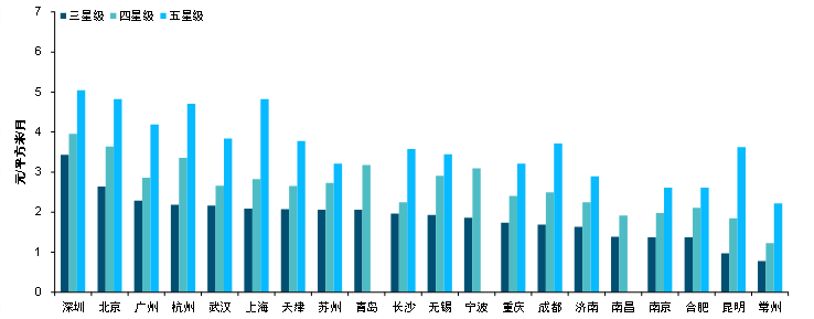 从不同星级物业服务收费来看,今年二十城各星级物业服务收费同比继续保持上涨,其中三星级同比涨幅相对较高。2022年12月,二十城整体三星级物业服务收费为2.01元/平方米/月,同比上涨0.07%;四星级物业服务收费为2.75元/平方米/月,同比上涨0.06%;五星级物业服务收费为3.90元/平方米/月,同比上涨0.06%。
