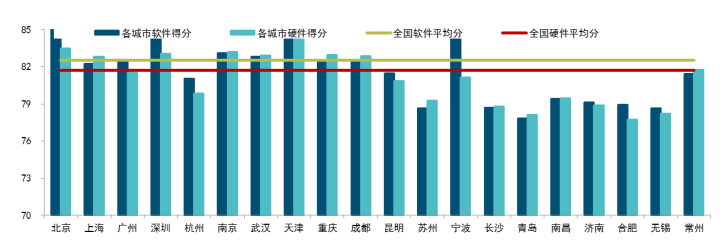 多数城市软硬件服务水平差距不大,深圳软硬件得分差绝对值较大。深圳软件得分分别比硬件得分高6.03分,为二十个城市中软硬件得分差绝对值最大的城市。主要原因为深圳硬件得分在二十城均值附近,软件得分明显领先,居二十城前列;其余城市软硬件得分差绝对值较小,除宁波、北京、合肥与杭州外,硬件得分与软件得分的差值为4.23、1.71、1.17和1.19,其余十五个城市软硬件得分差绝对值均小于1分,匹配程度较高。
