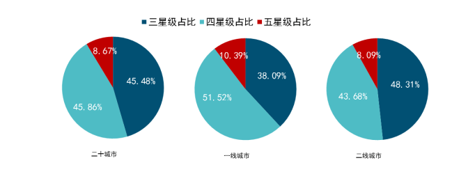 整体来看,二十城物业服务水平以四星为主,占比45.86%,四星级和五星级项目占比分别为45.86%、8.67%,五星级项目占比保持稳定;从城市分级来看,一线城市的四、五星级项目占比为61.91%,环比下降2.38%;一线城市中四星级项目占比为51.52%,环比变化不大。二线城市四星级项目占比为43.68%,环比变化不大;五星级项目占比为8.09%,三星级项目占比48.31%,四、五星级项目占比之和仍超过三星级项目。