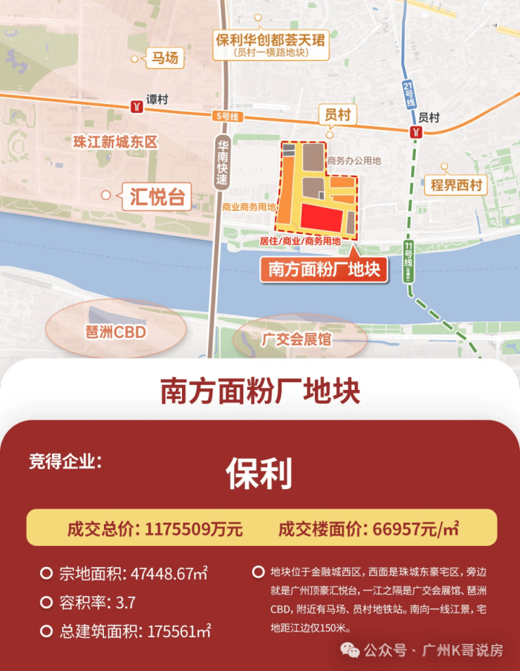 天河临江大道北侧AT080722地块(南方面粉厂地块),历经5小时厮杀,148轮竞价,项目2024年9月29日由保利地产拍得,最终以总价1175509万元斩获,折合楼面价66957元/㎡。扣除配建后,实际可售楼面价高达76502元/平。